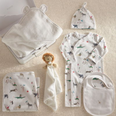 The lion comforter and printed blanket comforts little dreamers at nighttime and the coordinating knot hat and mittens will keep them cosy.