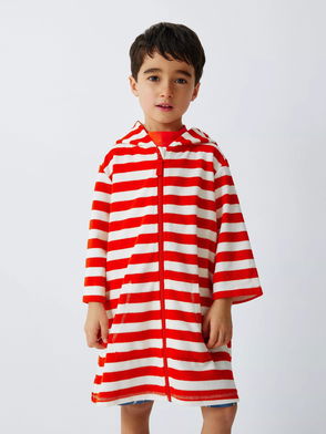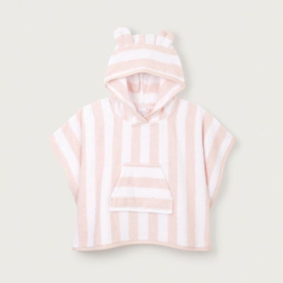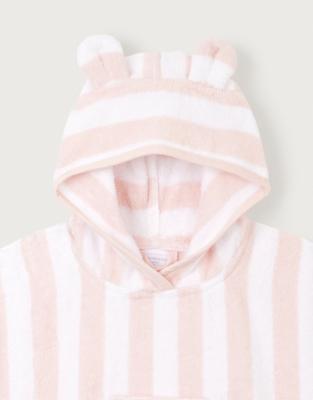 Our pure-organic-cotton-towelling poncho is the ideal accessory for a day at the beach or around the pool. Covered in bold pink and white stripes it has a classic beachside look with a practical front pocket that's shaped like a heart for a sweet touch. And the cosy hood is complete with 3D bear ears. Throw on little ones so they can dry off while covering up and before they're ready to jump in the water again.