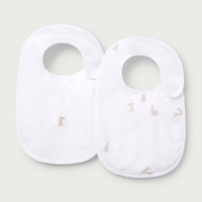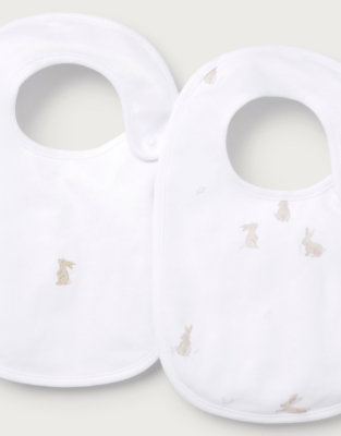 Keep baby mealtimes mess-free with our adorable set of two bibs made from super-soft pure organic cotton that's gentle on delicate skin. One features a sweet embroidered bunny on the front while the other is covered in a playful all-over bunny print. The soft 1x1 rib fabric provides stretch and comfort around little necks making these baby bibs perfect for everyday use. They're practical yet cute and make a lovely gift for new parents.