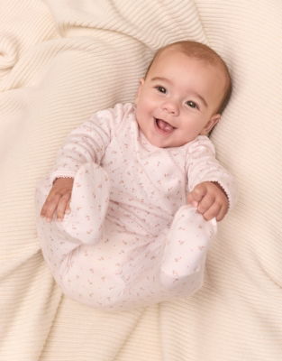 Wrap your little one in floral dreams with this charming baby sleepwear. The soft organic cotton is gentle against delicate skin and features our Megan floral pattern complemented by picot trim that adds a pretty detail. The wrap design makes bedtime changes easy with a footed design keeping little toes cosy.
