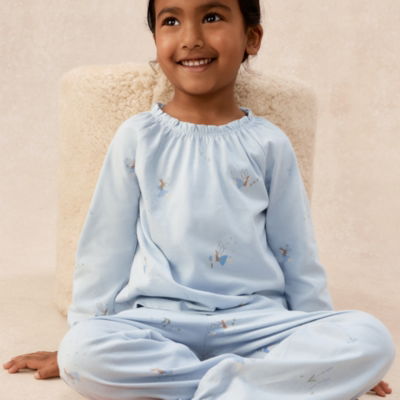 Dreams come alive with our magical fairy pyjamas. Featuring an enchanting garden fairy print on a soft blue background these girl's pyjamas have sparkle details adding whimsy at bedtime. The pure organic cotton feels soft against children's skin perfect for sleep.