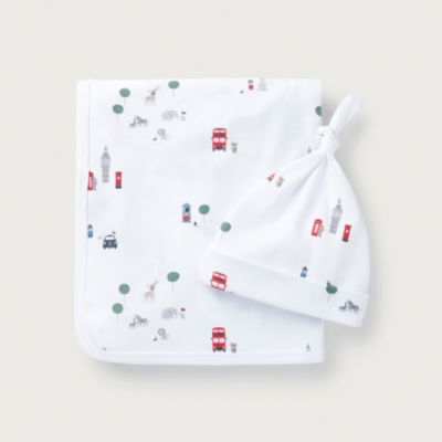 Made from pure organic cotton our matching set is ideal for keeping little ones snug at naptime. The knot hat will make sure tiny heads stay warm and the blanket adds another layer of softness - plus it makes a great keepsake and pairs well with our matching sleepsuit. The print shows zoo animals out exploring the city of London.