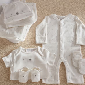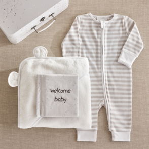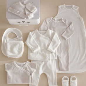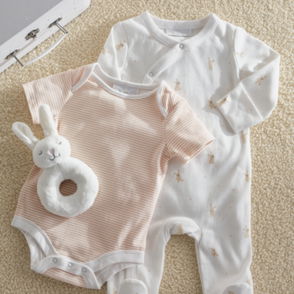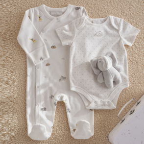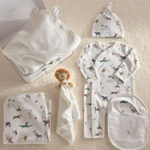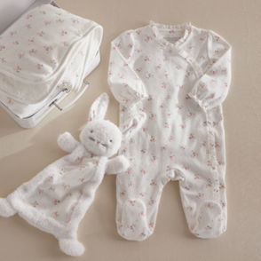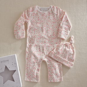 Our sleepsuit-and-hat duo is an ideal gift for new arrivals. Made from soft pure organic cotton this set is covered in a fun print of storks carrying baby animals in blanket bundles. The footless sleepsuit is fitted with integrated scratch mittens as well as having poppers at the legs for comfort and easy changing. Meanwhile the knot hat will keep little heads warm on outings or at naptime.