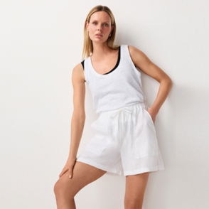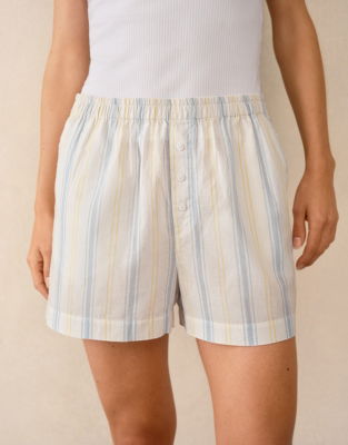 With delicate contrast stripes in pale blue and yellow these shorts are a springtime update on a classic nightwear style. In a boxy with an elasticated waist and mock button fly. Pair it with the matching shirt or swap for the trousers depending on the season and how warm you like to sleep to create a great mix-and-match set.