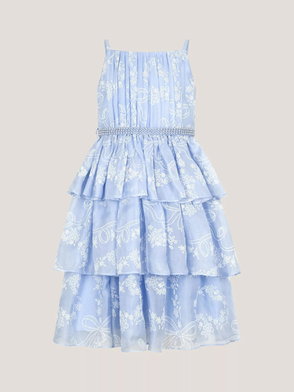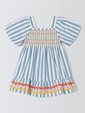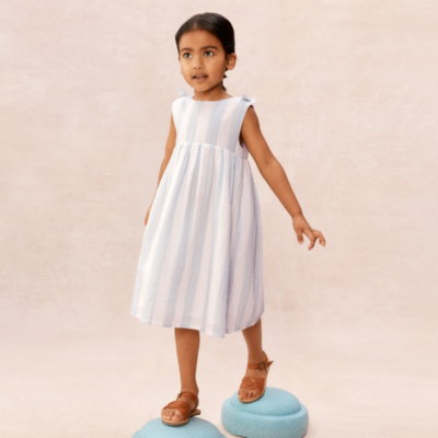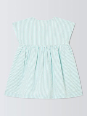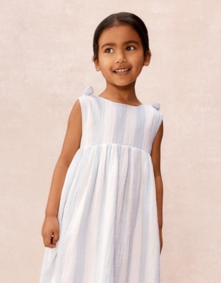 This charming dress is perfect for summer days and special occasions. Made from pure-organic cotton with a textured crinkle effect it features wide pale-blue-and-white stripes for a fresh classic look. The full skirt allows for plenty of movement and twirling. We especially love the bows on the shoulder straps that add a sweet finishing touch. The mock-horn buttons down the centre back give it a premium feel.