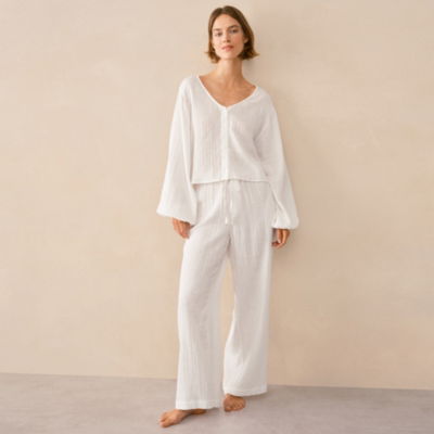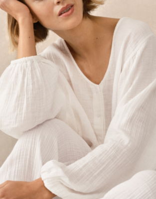 Light and floaty with an almost ethereal feel these PJs are so soft and comfy to sleep in but so pretty you'll want to wear them to chill out in at the weekend too. The modern collarless shirt is slightly cropped with voluminous boho sleeves accentuated with elasticated cuffs. The trousers are simpler with an elasticated waist and neat flat ties to finish. So light it almost floats double cotton is created using two beautifully fine layers and boasts a lovely relaxed texture as if it's been woven with pockets of air. Due to the double-faced nature of this fabric it will become more textured with washing. We love this relaxed look and the fabric will stretch back into shape with wear.