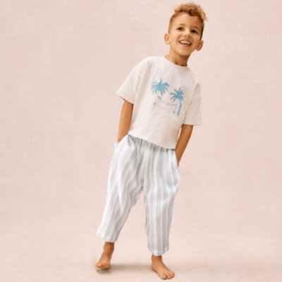 The woven double cotton balloon leg trousers have a stylish two-tone blue stripe pattern on a crisp white base making bedtime special. Made from organic cotton they're super soft against the skin and ideal for little ones who like plenty of wriggle room.
