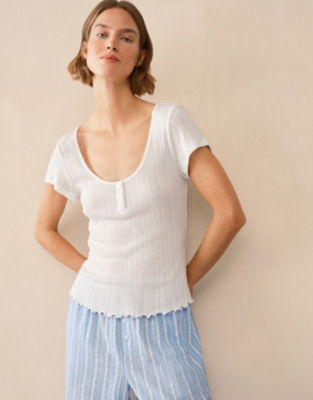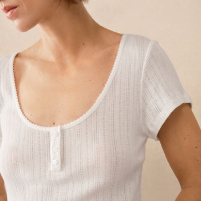 In a pretty pointelle fabric with delicate stripes of openwork stitching lettuce trim along the hemline and picot trim this top is ideal for matching with any of their short or trouser separates.