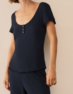In a pretty pointelle fabric with delicate stripes of openwork stitching lettuce trim along the hemline and picot trim this top is ideal for matching with any of our short or trouser separates. We have matching pointelle trousers plus a long-sleeve top option to create a great mix-and-match set.