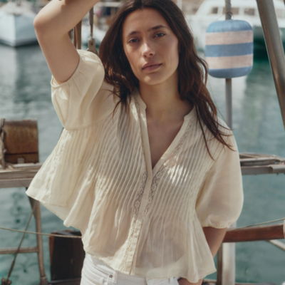 The soft ramie blouse has narrow pintucks on the front and back panels for delicate shaping and to create a beautifully textured look before extending into a gently gathered raised waist panel.