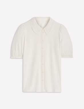 Floaty elasticated-cuff sleeves and lace inserts along the notch neckline and down the sides of the button placket give the blouse a carefree bohemian feel.