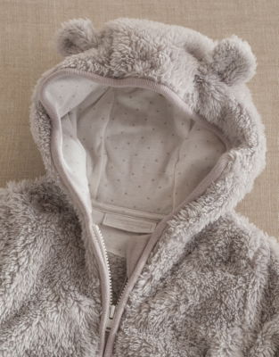 A sweet little set for new arrivals. Our soft fleece romper is made using recycled polyester and cotton - sure to keep them snug and warm - and has 3D bear ears on the hood for a novelty touch. We've also included our Kimbo elephant comforter - just the thing to make them smile.This set comes in a suitcase-shaped gift box so there's no need to gift wrap - but you can still add a free gift message at checkout.