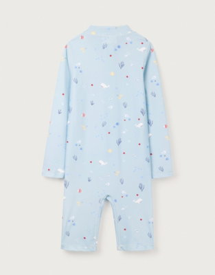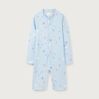 A star fish a whale and a puffer fish all swimming around this ocean-themed surfsuit. Ideal for little ones to splash around in it's got a contrasting zip fastening from the funnel neck to the waist for easy removal.