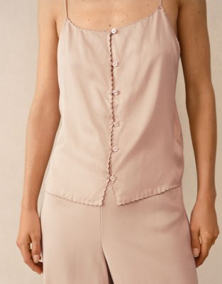 This cool and elegant camisole-and-trousers set feels wonderful against the skin. Cut from pure silk this style comes in a modern camisole style with fine straps and scalloped edges. The silk has a sophisticated matte sandwashed texture to add an extra touch of elegance to your nightwear collection. All our silk nightwear is a luxurious 19 momme. Momme refers to the weight of silk - the higher the momme the heavier and more premium the silk.