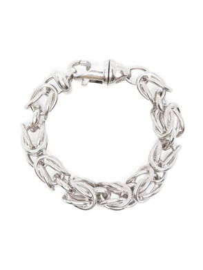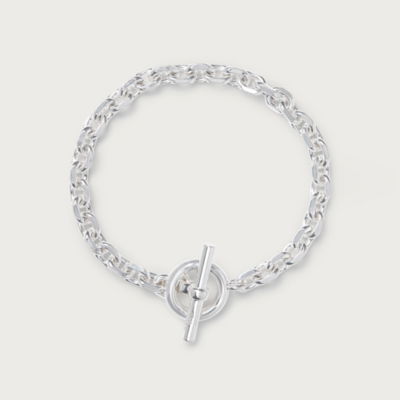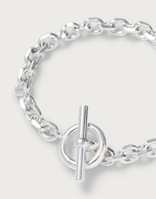The silver-plated bracelet has a chunky chain design that pairs well with everyday looks. It has a T-bar fastening to keep it securely in place.