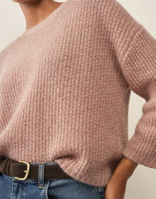 Beautifully crafted from a fluffy tactile yarn made from a blend of wool and mohair this knitted jumper brings texture and style to everyday dressing. The soft airy yarn feels so luxurious and subtle detailing makes it feel both feminine and relaxed. We love the contemporary feel of the wide sleeves dropping to just above the wrists and the short narrow line of ribbing on the cuffs and hem which emphasises the modern boxy shape.