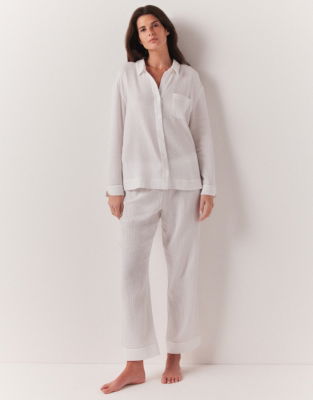 Made from lightweight organic double cotton the pyjama-shirt-and-bottoms set is ideal for warmer nights. They've added stitch detailing along the pocket cuffs and hem of the trousers for a contemporary touch and mother-of-pearl buttons down the front for a premium finish.