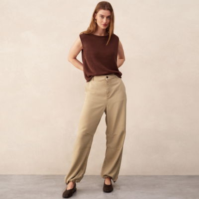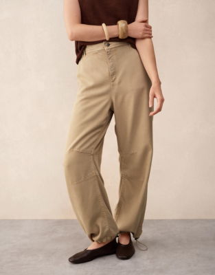 A relaxed casual trouser with a cool modern shape tapered towards the bottom and with elasticated cuffs to create gentle drapes around the ankle. Made from a fluid Lyocell fabric that has been treated to have a soft tactile and lived in finished - like a favourite pair of trousers from the first time you put them on. This piece is garment-washed - a process that includes a specific wash treatment to create a relaxed lived-in look and a soft tactile fabric.