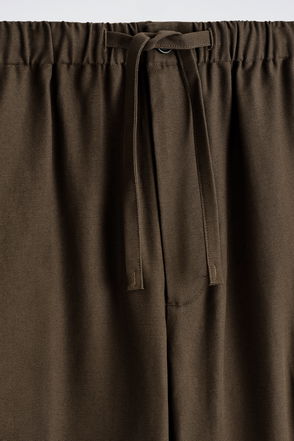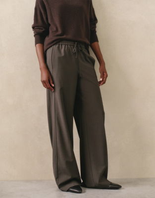 A classic pair of wide-leg trousers in lightweight cosy wool with added stretch. These offer a casual alternative to tailored styles but they're still versatile. They have practical side pockets as well as a discreet pocket on the rear too. Top-stitch detailing and an elasticated waist with a matching-fabric drawstring tie. Useful for casual weekend looks - team with tanks tees and chunky knitwear.