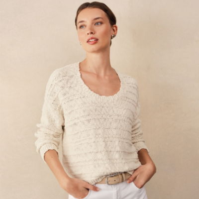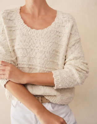 With a feminine scoop neckline and a neat cropped shape the pure organic yarn has a natural texture to it accentuated in the horizontal stripes across the body while the long sleeves are unstriped for contrast.