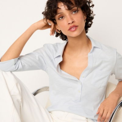 Designed with quality practicality and effortless style in mind our much-loved jersey shirt is made from pure organic cotton that is soft and breathable. Everything about this shirt is designed to be flattering: the wide small-button placket three-quarter sleeves with turned back cuff deep curved hem and the simple pleat in the yoke on the back. A wardrobe hero you'll turn to again and again.
