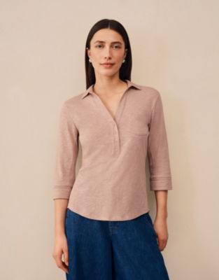 Designed with quality practicality and effortless style in mind our much-loved jersey shirt is made from pure organic cotton that is soft and breathable. Everything about this shirt is designed to be flattering: the wide small-button placket three-quarter sleeves with turned back cuff deep curved hem and the simple pleat in the yoke on the back. A wardrobe hero you'll turn to again and again.