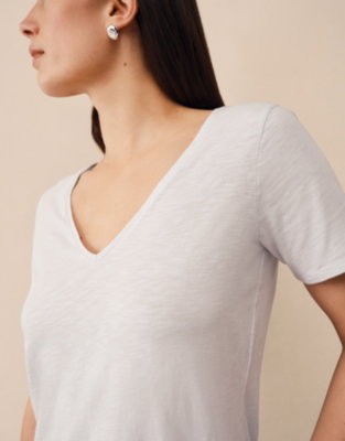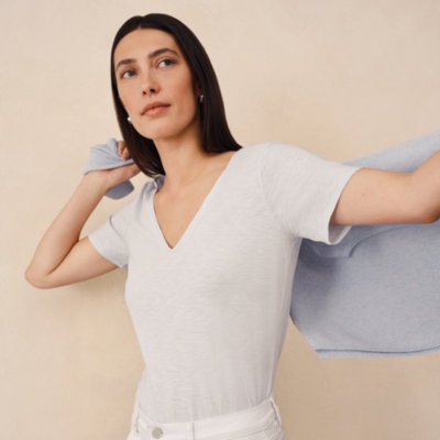 The jersey V-neck T-shirt is a casual staple with dainty narrow trims and a new improved fit. The organic slub cotton is woven from yarn with slight irregularities which creates a modern textured fabric ideal for capturing that weekend feeling.