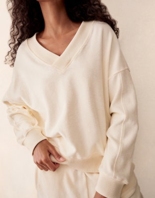 We love the soft towelling fabric of our relaxed-shape sweatshirt made with pure cotton for breathability whatever the weather. Dropped shoulders and ribbed trims give it a cosy relaxed shape and the flattering V-shape on both the front and back of the neckline makes it feel elevated. Style with our matching towelling joggers for a travel-wardrobe staple.