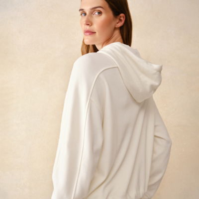A modern new style for the Ultimate range of wardrobe-hero loungewear staples. Ultimate fabric is made from an organic-cotton blend for a warm reassuringly weighty feel and a peachy-soft touch. Relaxed dropped shoulders sporty seam details a big roomy hood with drawstrings and a drawstring round the hem to allow it to be worn loose or ruched in for extra volume. There are matching joggers available too.