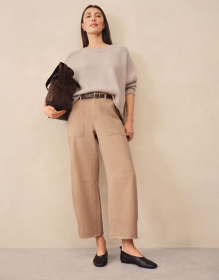 With a sculpted shape to give the feeling of volume our barrel-leg trousers are made with darts on the inside leg seam to ensure that characteristic barrel outline holds well with minimal drape. A versatile modern style that is flattering and easy to wear. The patch pockets on the front complete this contemporary look.