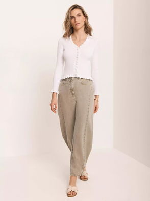 The neckline flows from a crew into a refined V and the softly fluted sleeves add shape. Chic easy and quietly polished.