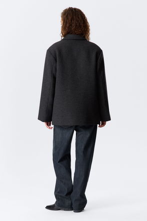 Blazer, Wool-twill, Shoulder pads, Buttoned cuffs, Two side flap pockets, Button fastenings through double-breasted front, Fully lined, Back vent, Mid-weight, non-stretchy fabric.