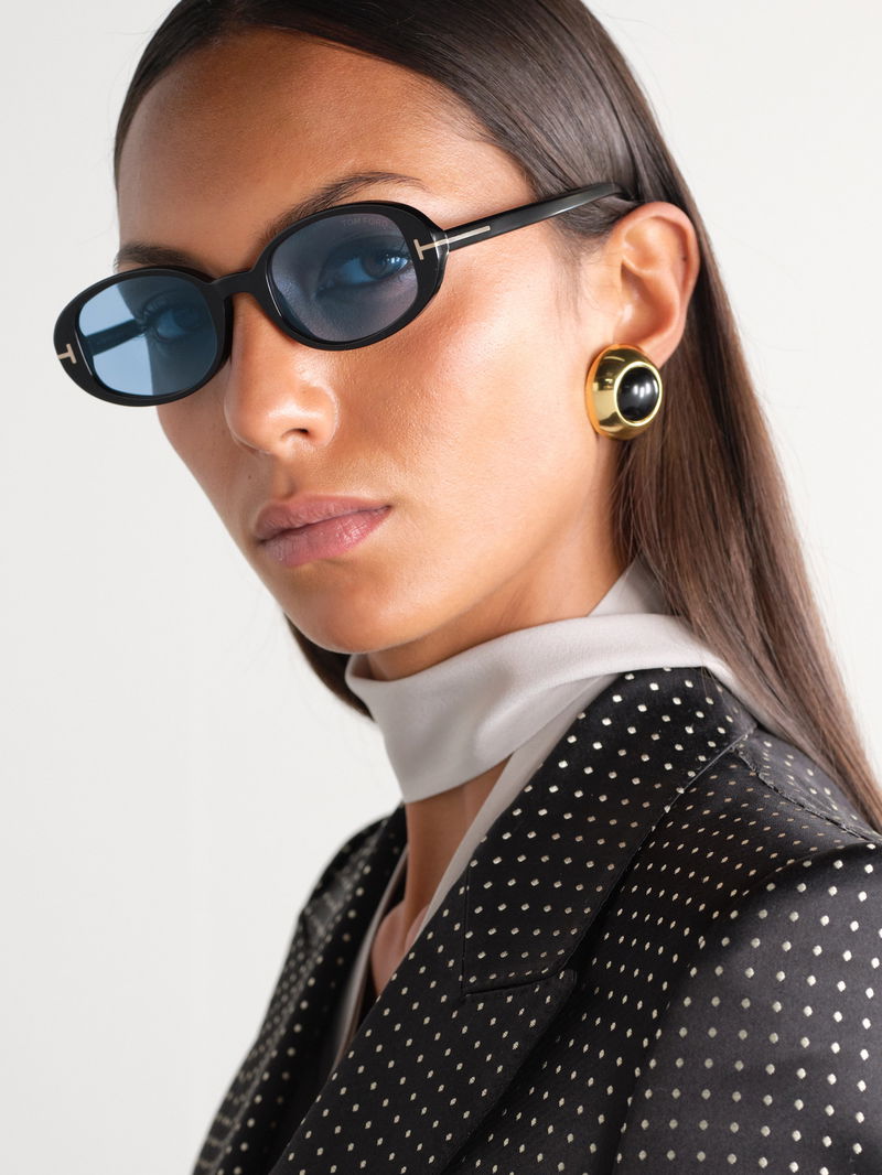 TOM FORD's 'Iggy' sunglasses have oval-shaped frames and tinted blue lenses that give them a cool, retro feel. They've been made in Italy from glossy black acetate and feature silver-tone 'T' hardware along the temples.