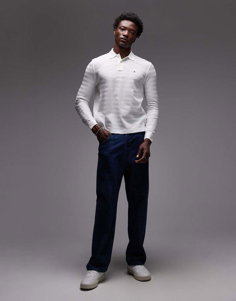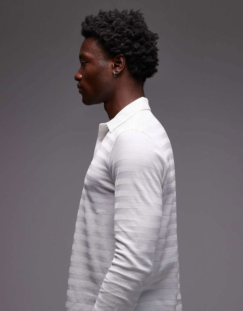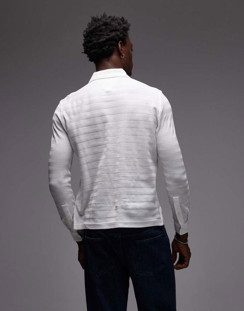 Long Sleeve Herringbone Texture Polo Shirt In White