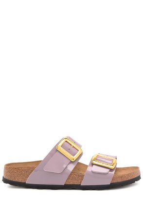 Slip-on style Double straps Open toe Molded footbed Flat sole.