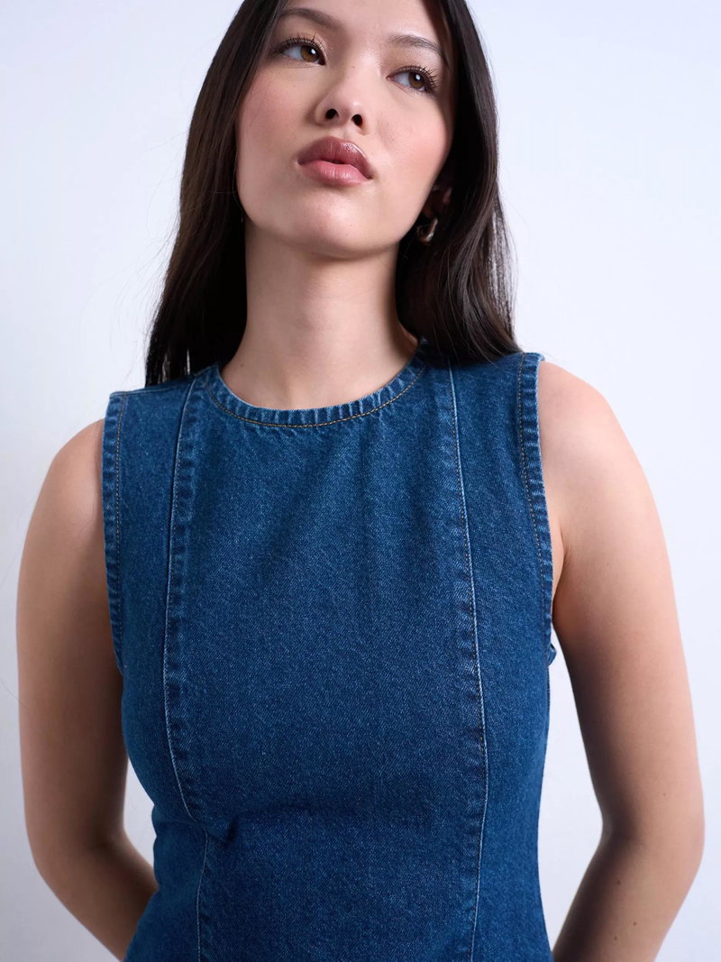 Sleeveless Denim Midi Dress, Blue