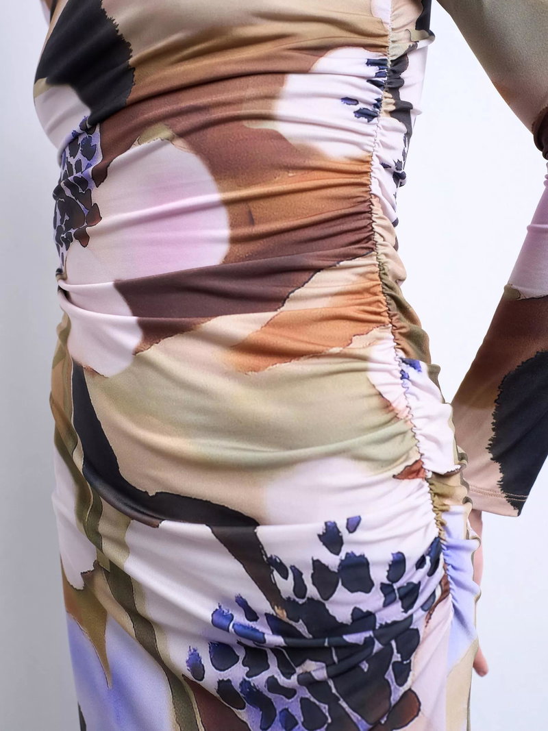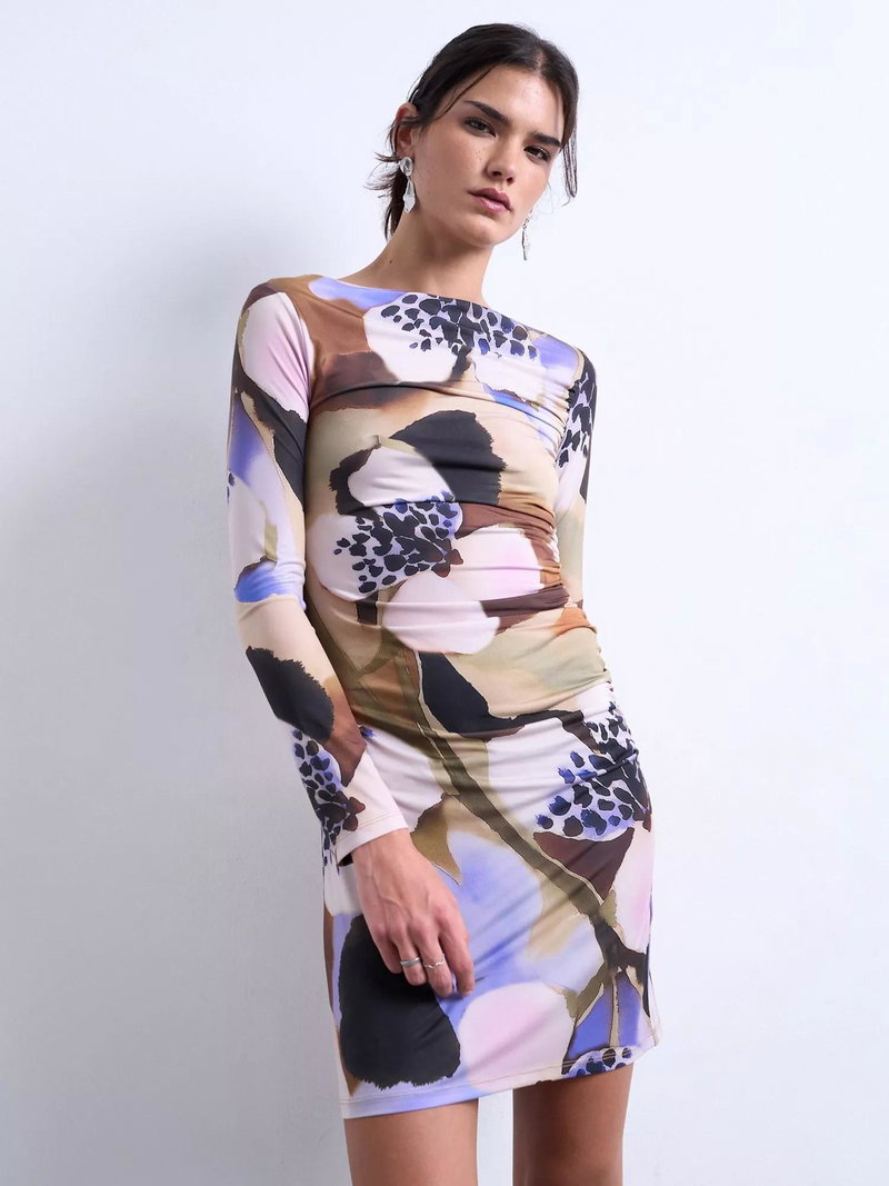 This long-sleeved mini dress brings a clever twist to everyday style. The ruched bodycon fit and bold florals invite you to stand out, while soft stretch material ensures you feel comfortable all day long.