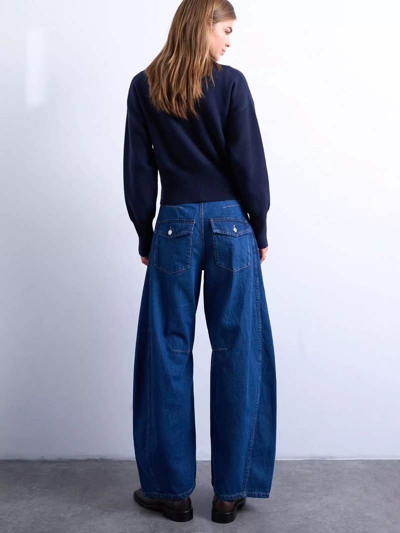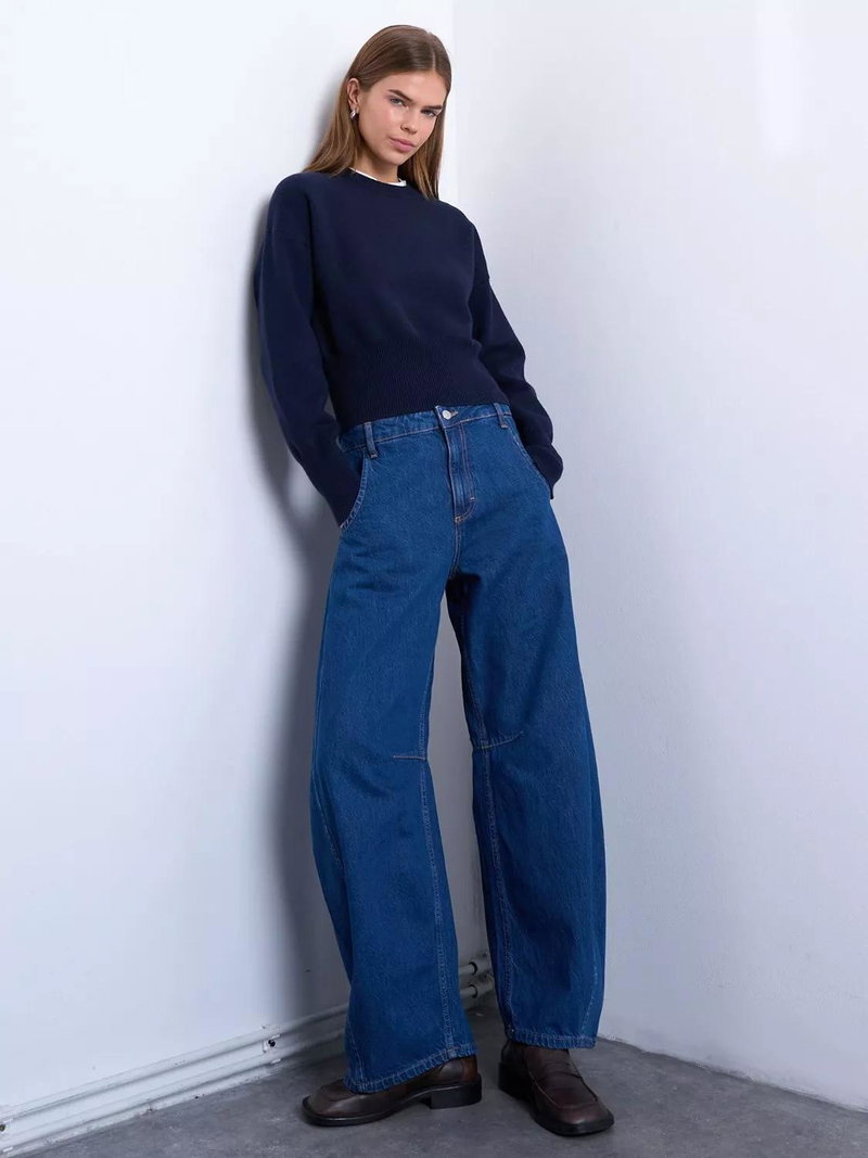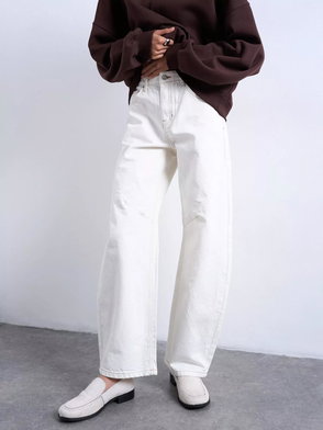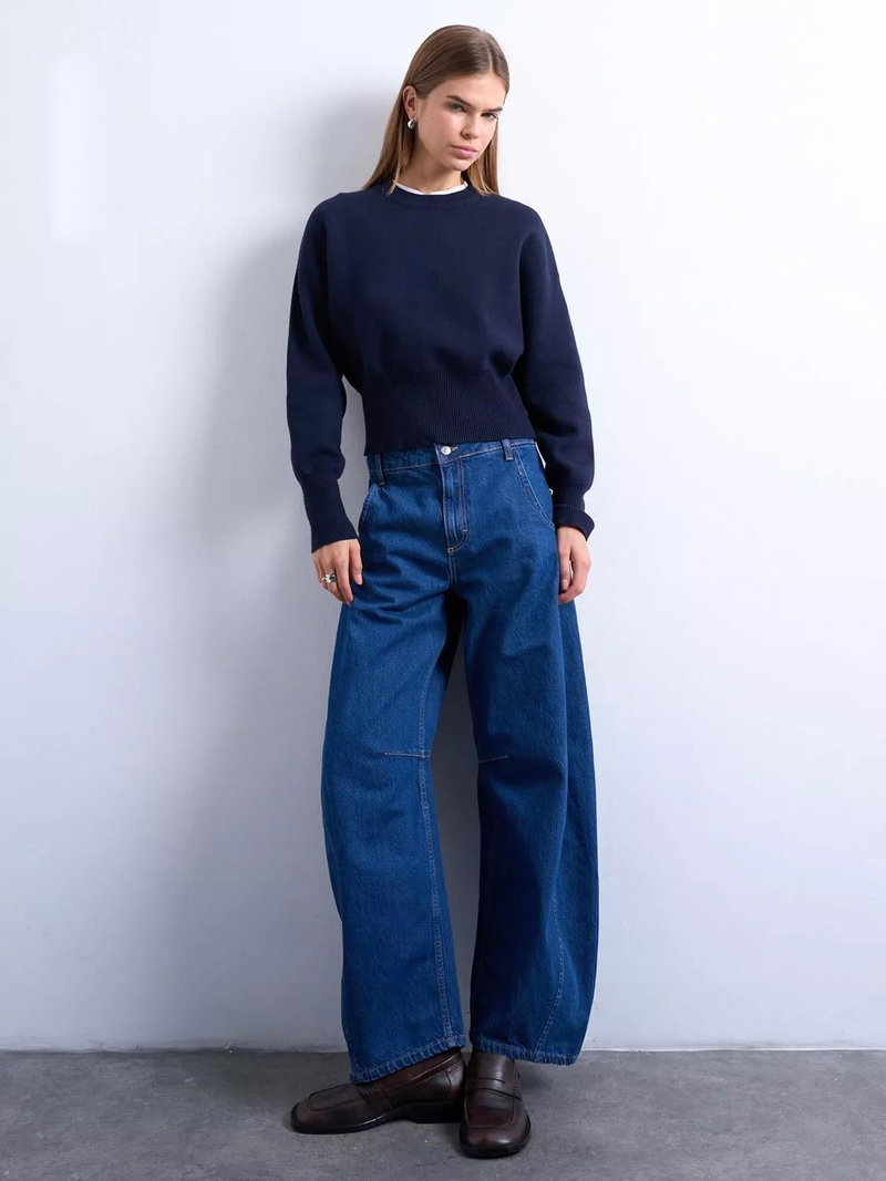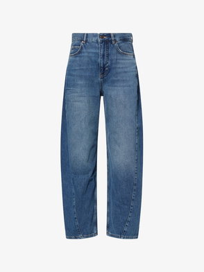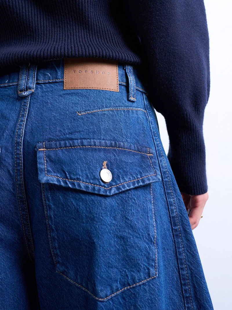 A pair of horseshoe barrel leg jeans from Topshop. Made from pure cotton featuring a high rise and a classic button and zip fly, they fall to a regular length.