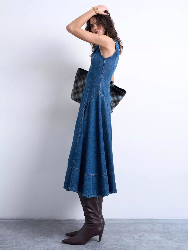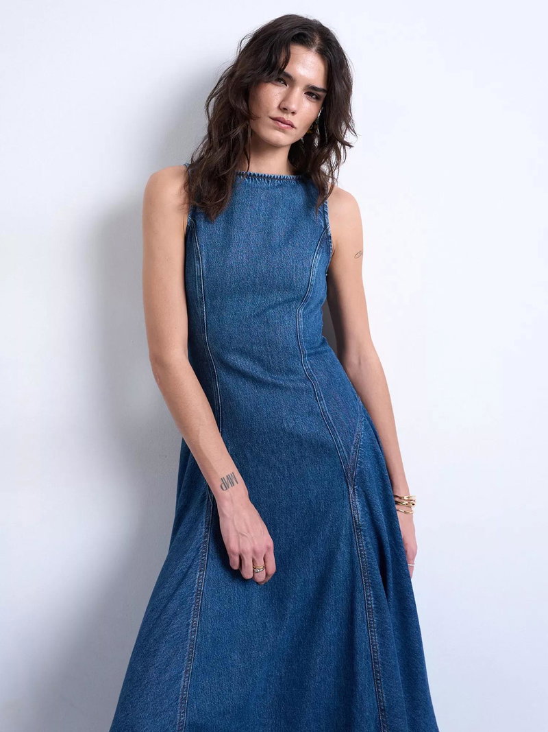 A denim midi dress by Topshop. Its sleeveless silhouette and crew neck keep you comfortable, while the flared A-line skirt and textured denim finish ensure you feel fresh on summer days.