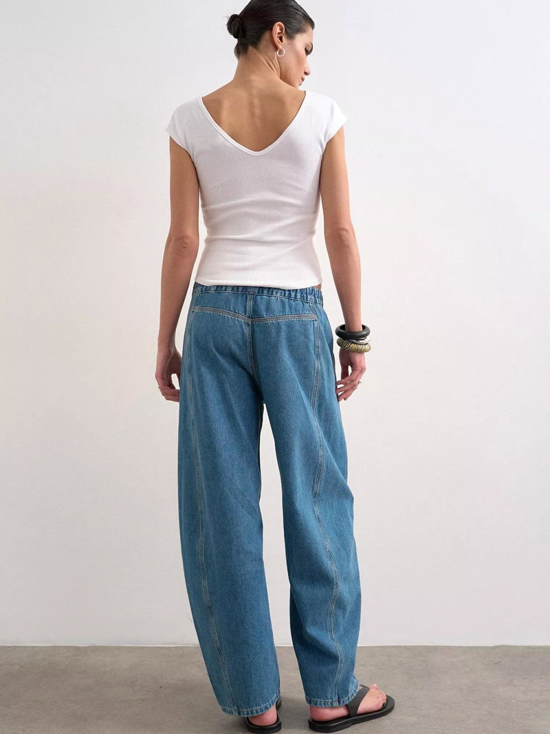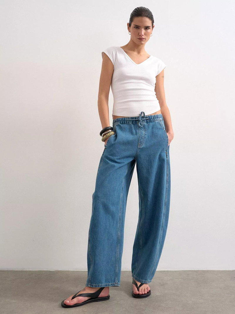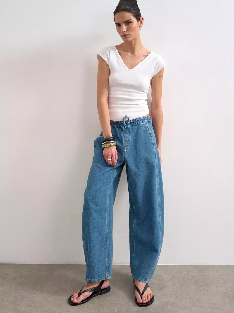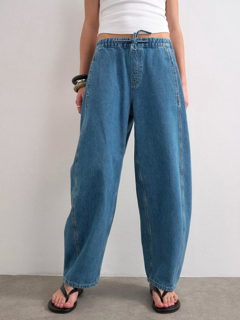 A pair of slouchy, barrel leg jeans from Topshop, crafted from pure cotton denim with a mid rise waist and elasticated drawstring.