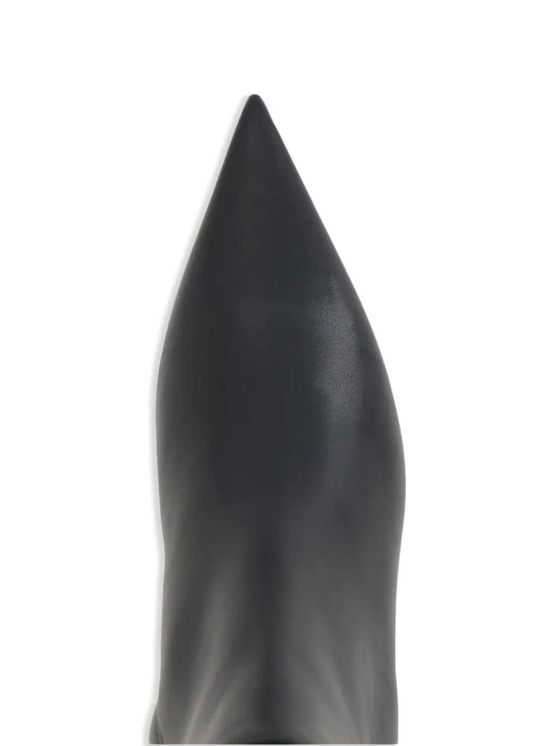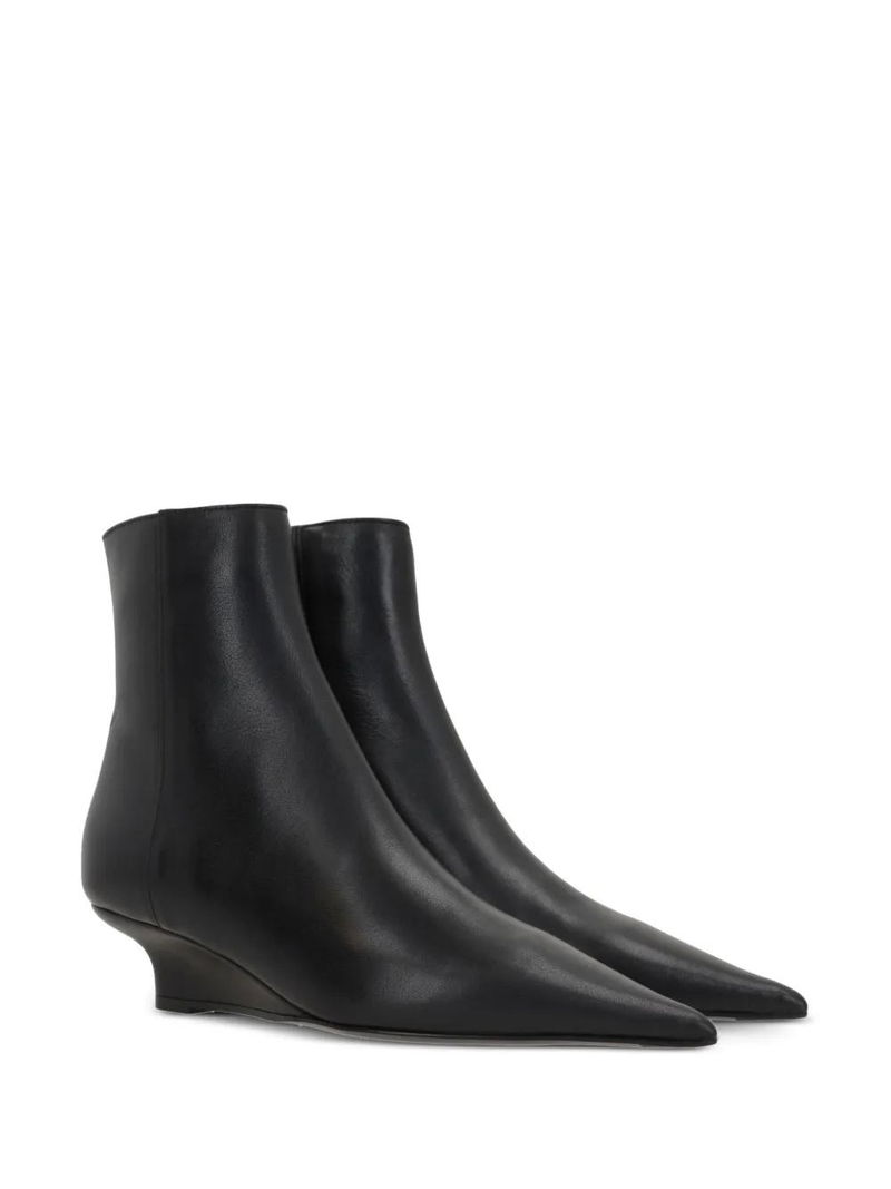 Black, side zip fastening, branded leather insole, low wedge heel, pointed toe.