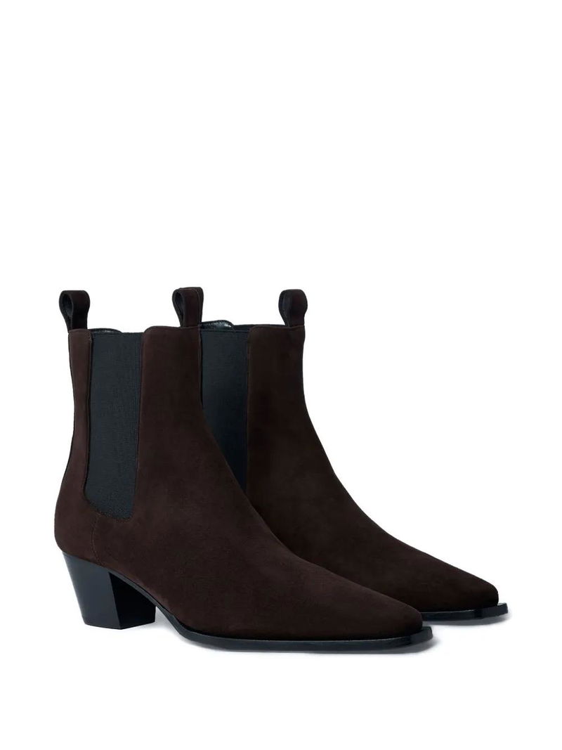 Brown suede pointed toe pull tabs block heel.