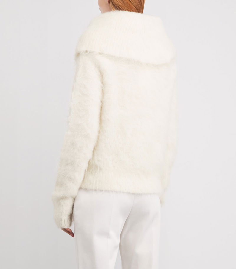 Its exaggerated roll neckline frames the silhouette with sculptural drama, while the plush texture promises enveloping warmth on winter days.