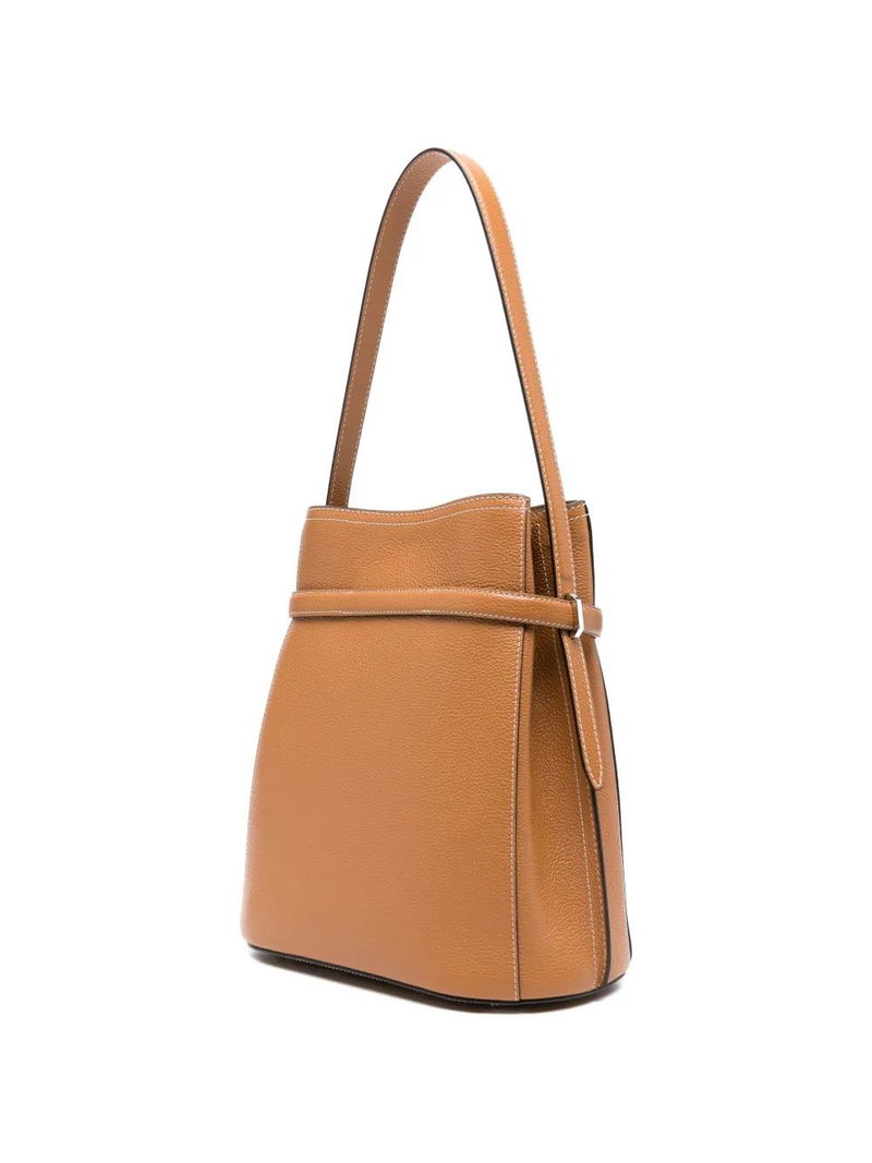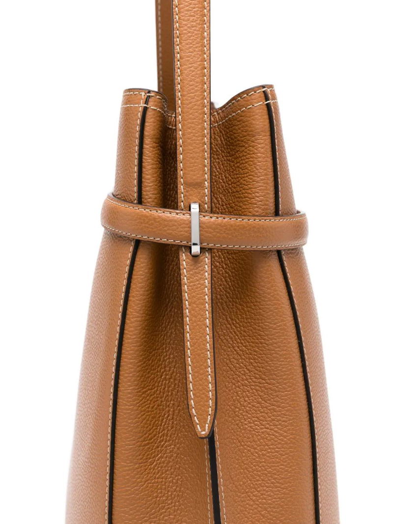 Light brown grained leather silver-tone hardware top handle internal slip pocket bucket style This piece comes complete with a protective dust bag.
