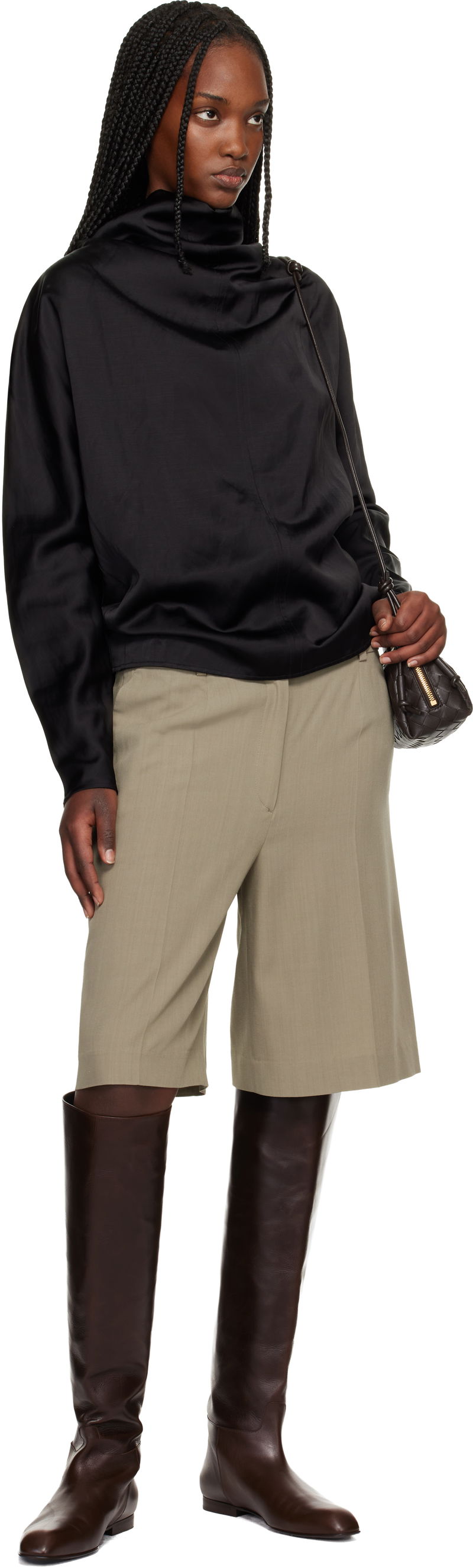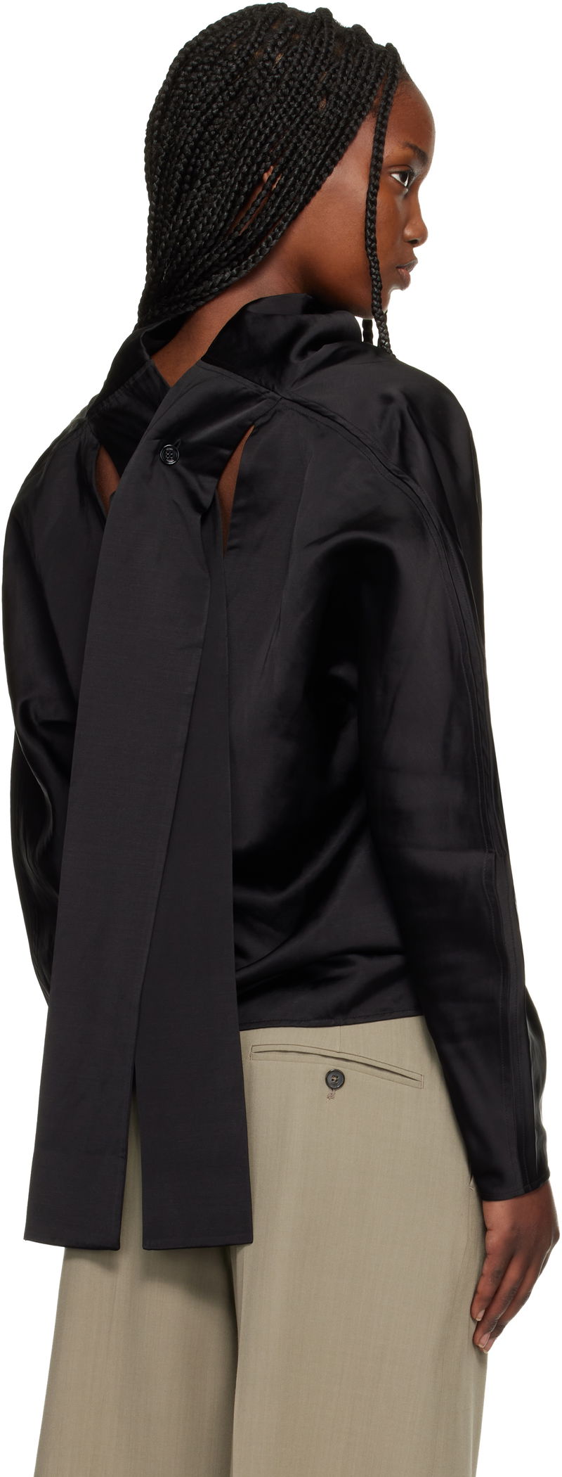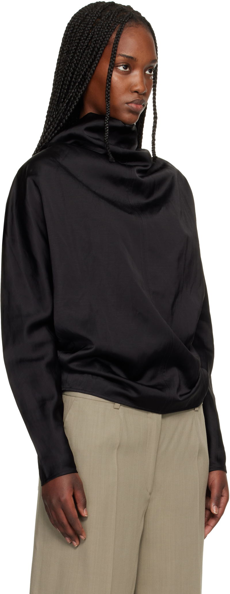 Viscose-and linen-blend satin blouse. Draped construction. Integrated scarf at cowl neck. Button fastening at back collar.