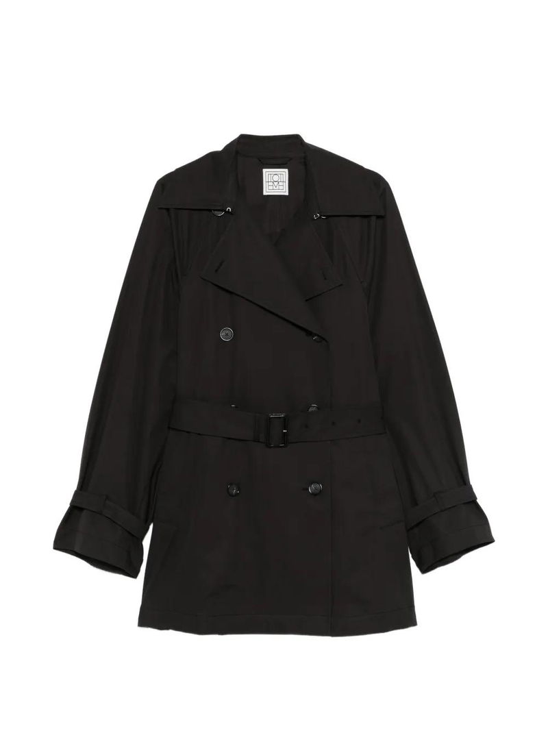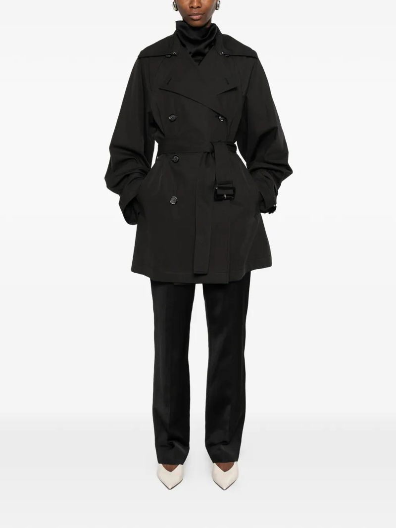 Black, double-breasted, button fastening, belt, long sleeves, buttoned cuffs, pointed collar.