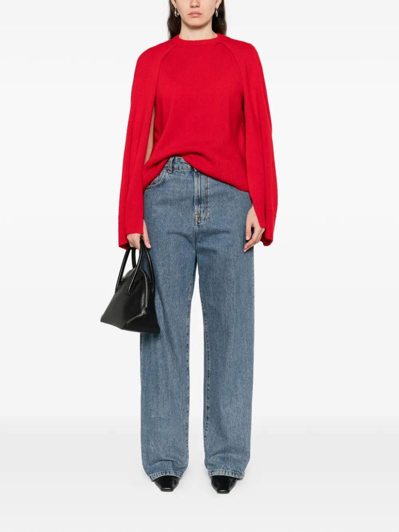 Red cut-out detail round neck ribbed trims long sleeves straight hem cape.