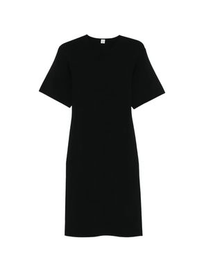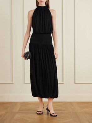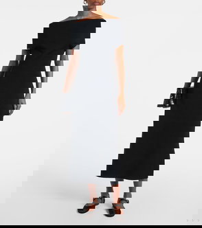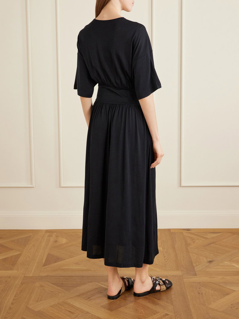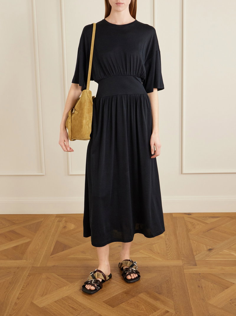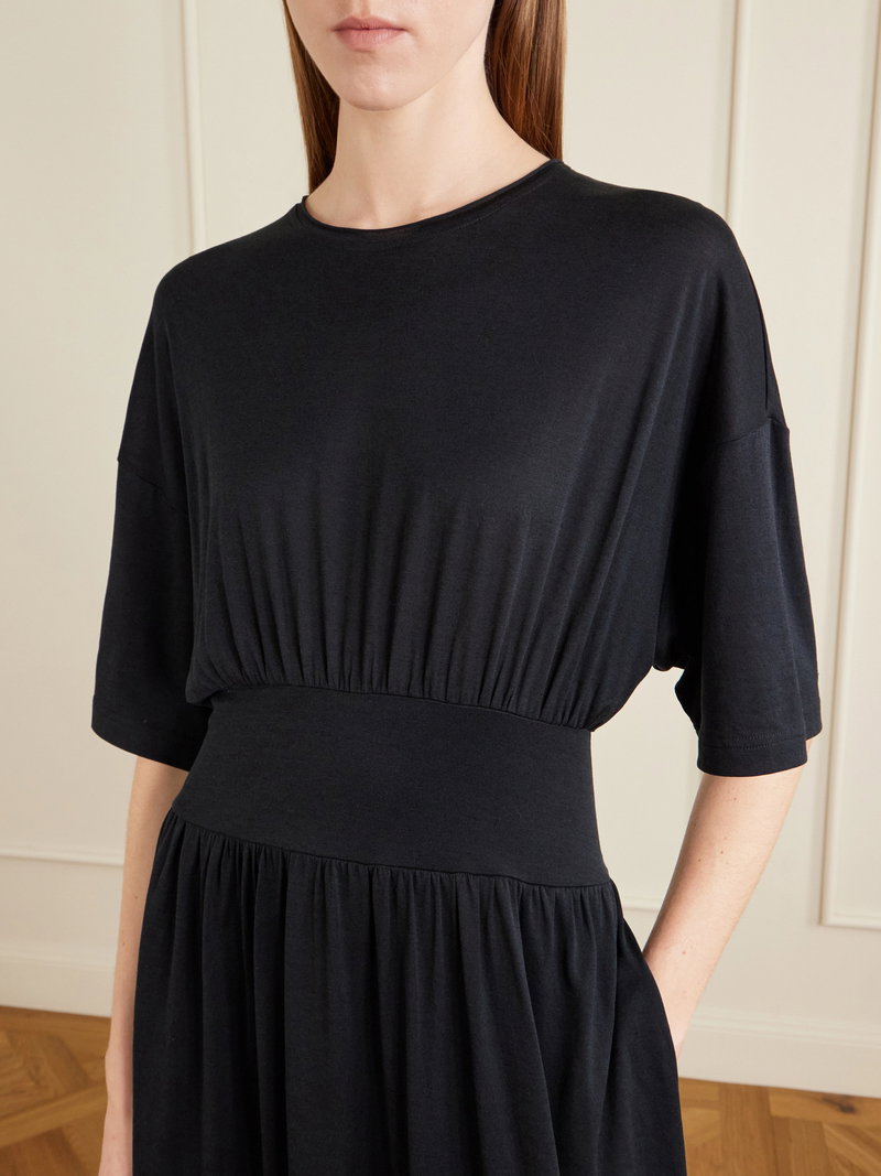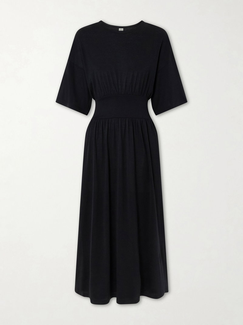 TOTEME’s dress is cut from a soft cotton and silk blend, giving it a fluid yet lightweight feel. Designed with a relaxed T-shirt silhouette, it features a gathered waist that gently defines the shape before falling into a midi-length skirt. Effortless and understated, it’s an easy choice for warm-weather dressing.