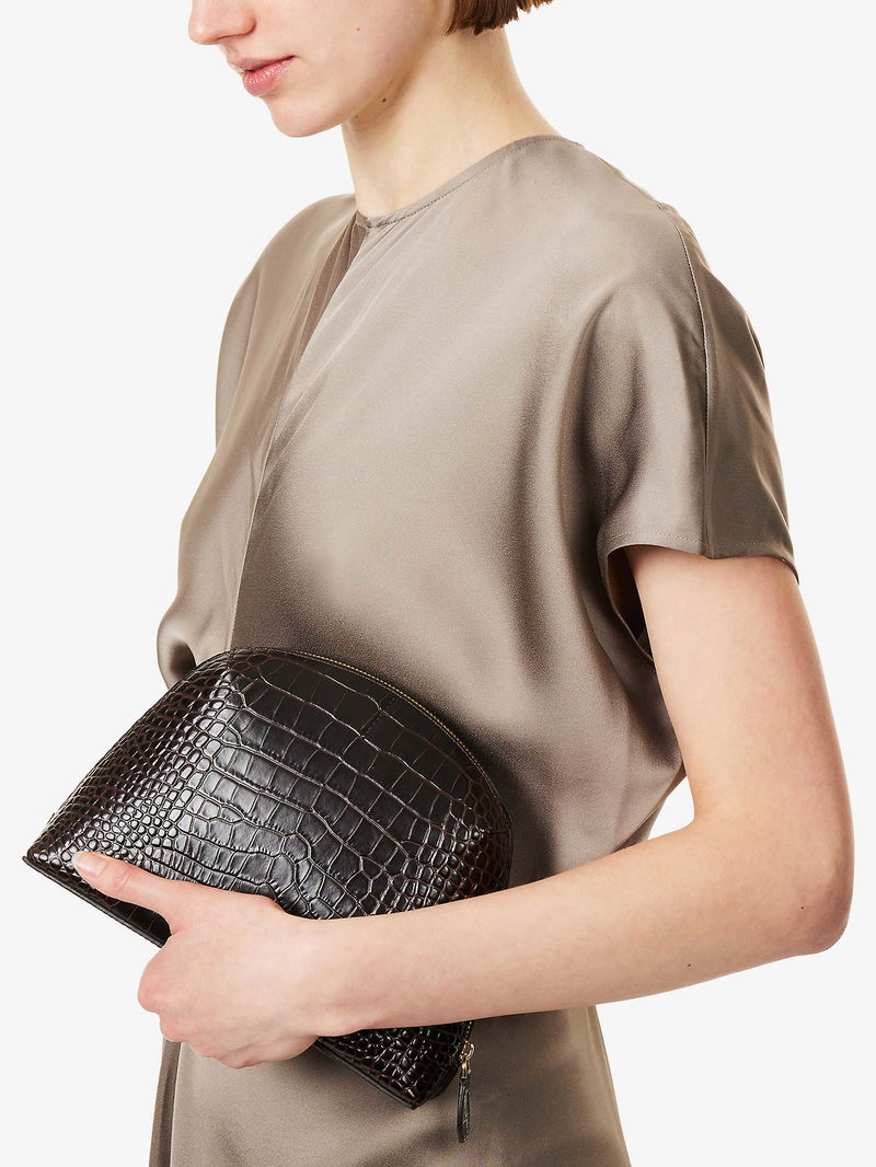 Curved shape, foiled branding at front, all-over croco-embossed leather, gold-toned hardware, one main compartment, internal slip pocket, fully lined.