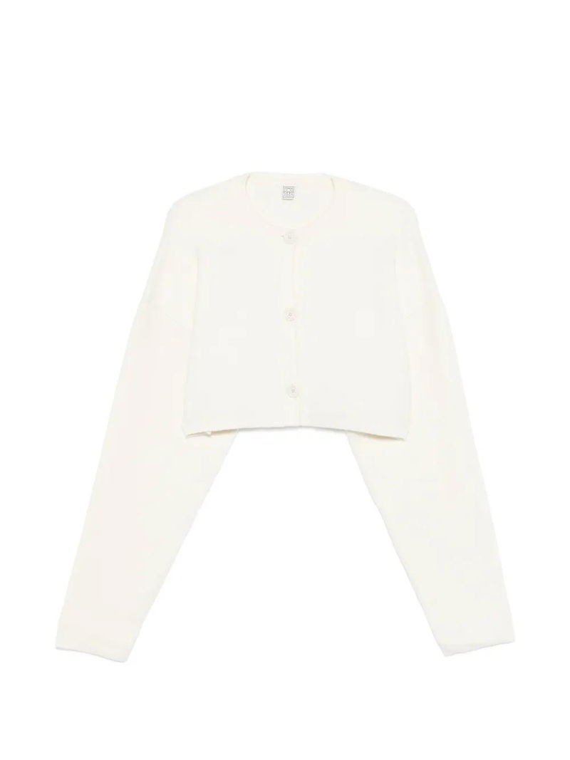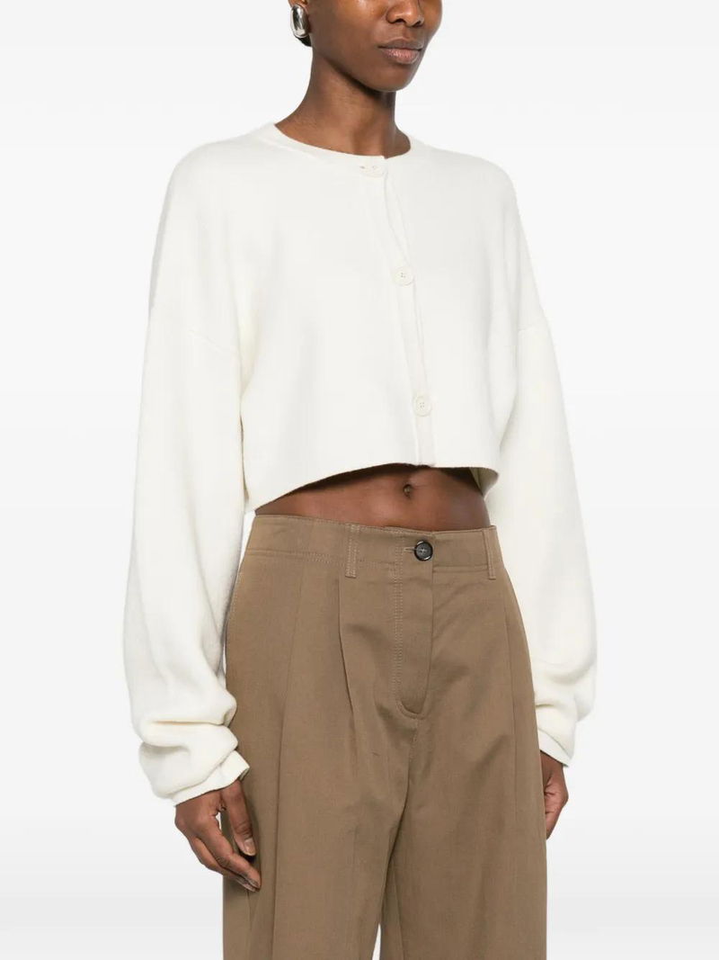 Beige, button fastening, cropped style, round neck, long sleeves.